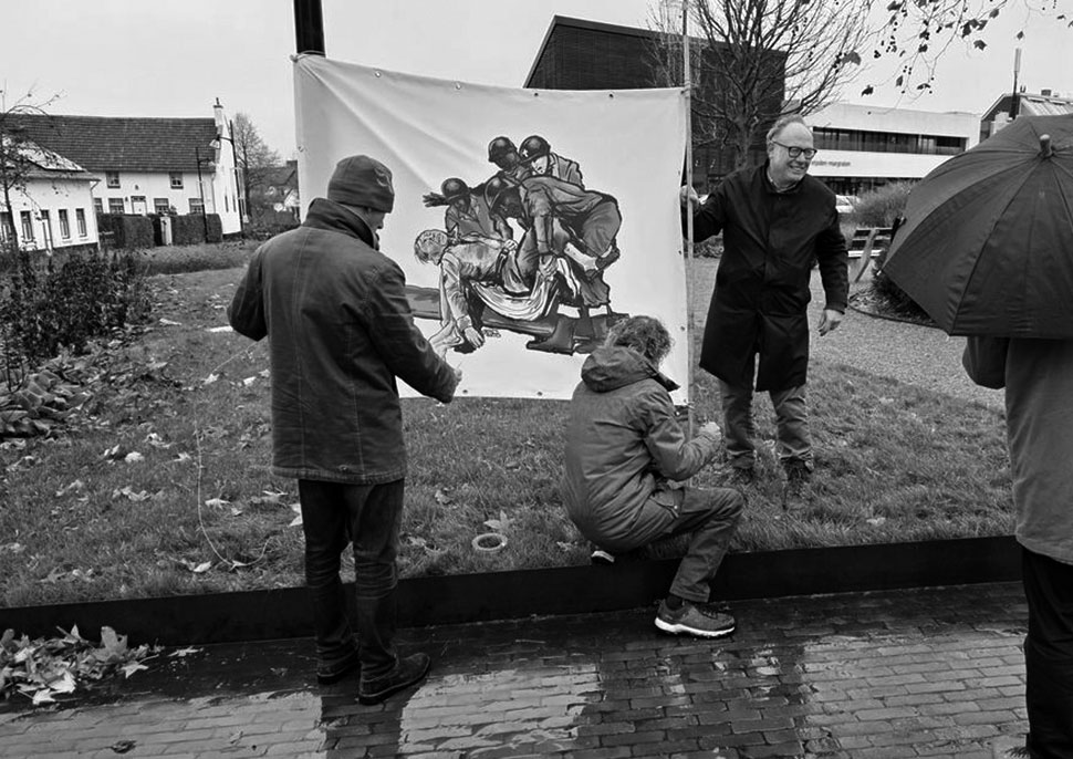 Op Black Friday voerde onze tekenaar Berend Vonk samen met Toon Hezemans en Jean Gouders een stille actie in Margraten. Aanleiding was het verwijderen van panelen over zwarte bevrijders uit het bezoekerscentrum van de Amerikaanse begraafplaats. De drie plaatsten een groot spandoek bij het Wigginspark met een indringende afbeelding van zwarte soldaten die een witte [...]